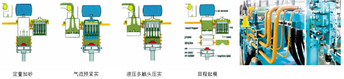 靜壓造型機(jī)采用氣流預(yù)緊實(shí)+液壓多觸頭壓實(shí)、模板反壓實(shí)+液壓多觸頭壓實(shí)的緊實(shí)技術(shù),進(jìn)一步提高了砂型分型面硬度和緊實(shí)均勻度,提高鑄件精度。